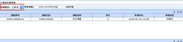 2.线上申请补考请直接点击“申请”,系统将自动提交给开课院系审核。申请后可切换申请情况到“已申请”,查看已经申请的补考记录。
