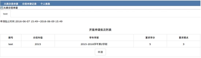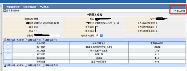 (五)教务处在报名模块中分别设置了相应院系(专业)要求的最低阶的必修课程信息,以便于院系浏览检索学生数据;其中,已修读高阶课程的学生在报名时不必担心系统设置的相应课程要素,院系在录取前应根据分流方案逐一审核报名学生修读课程情况是否达到要求。
