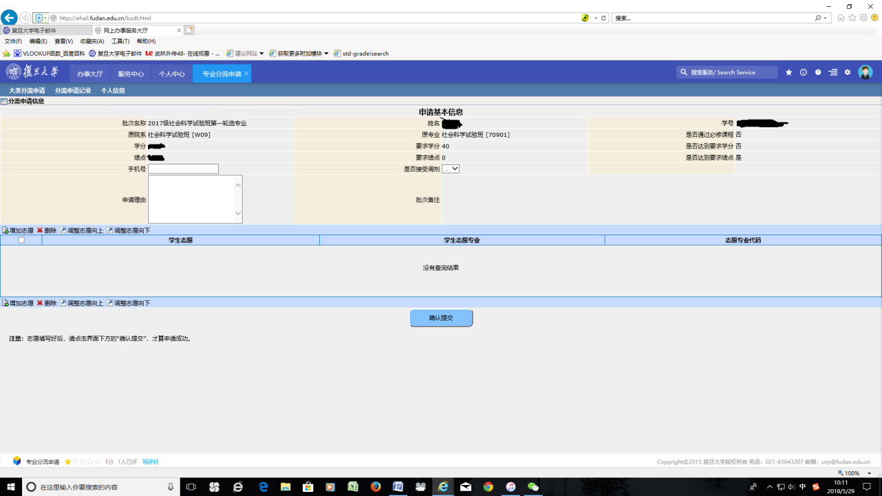 (一)各试验班学生须在上述指定时间内登录网上办事服务大厅(http://ehall.fudan.edu.cn/),搜索“专业分流”,点击进入服务,选择相应的专业进行志愿填报,并填写报名信息(建议使用IE11、Firefox或Chrome浏览器报名);学生在填写完专业志愿后,请务必注意点击“提交”按钮。未在指定内时间报名者,不能获得相应轮次的专业分流录取。