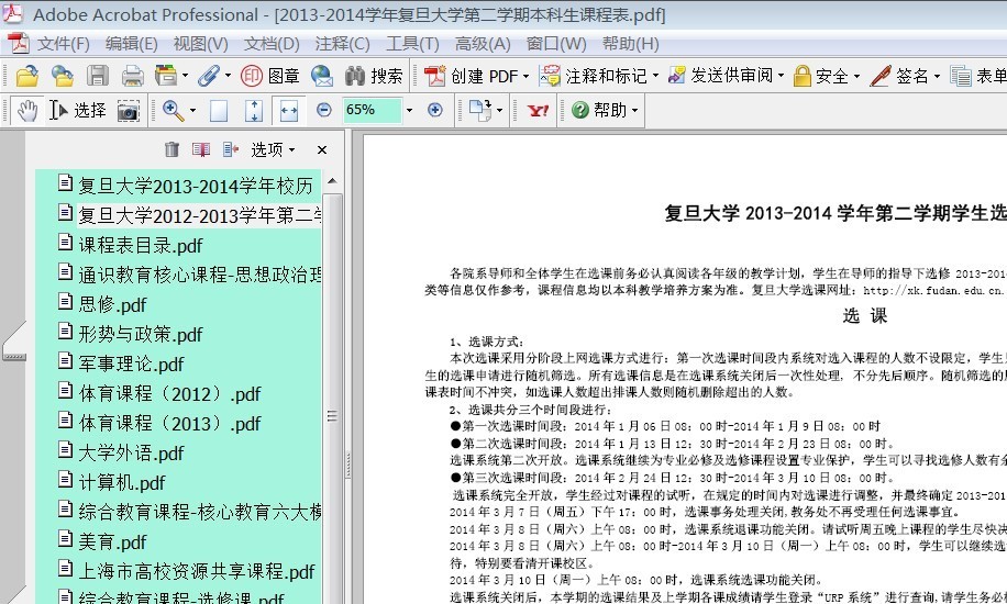 为了贯彻这一精神,本学期我们提供上述PDF和excel两种格式的课表文件(另有URP系统“电子选课书”可查看),方便大家按需求直接使用或编辑。其中PDF的文件包含有书签页(如图
