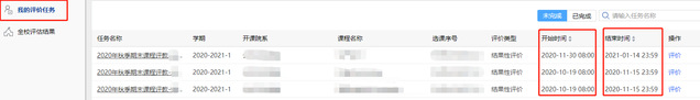 按系统设计,期末评教(“我的评价任务”模块)中每门课的评教开始时间和截止时间不完全一致(如图)。原则上,评教功能在每门课的期末考试之前关闭,为避免错过评教时间,请同学们及时登录http://ce.fudan.edu.cn查看“我的评价任务”,并按时完成评教。