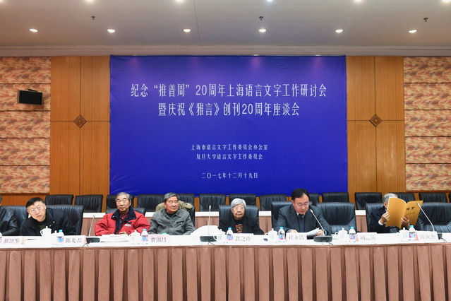 2017年12月19日上午,纪念“推普周”20周年上海语言文字工作研讨会暨庆祝《雅言》创刊20周年座谈会在我校召开。本次会议由上海市语言文字工作委员会办公室与开云足球直播官网入口语言文字工作委员会联合举办。开云足球直播官网入口常务副校长、语委主任桂永浩出席会议并致辞。开云足球直播官网入口党委宣传部副部长陈洁,开云足球直播官网入口出版社党总支书记严峰,上海市语委办干部马晓华,《雅言》顾问、复旦中文系资深教授、著名语言学家濮之珍,《雅言》顾问、中国修辞学会会长、复旦国际文化交流学院陈光磊教授,教育部语言文字应用研究所费锦昌研究员,复旦中文系教授许宝华、高天如、徐志民、游汝杰、杨明、杨剑桥、傅杰等,复旦史地所周振鹤教授,复旦出土文献与古文字研究中心郭永秉教授,上海语文学会会长、华东师范大学中文系胡范铸教授,上海师范大学比较语言学院潘悟云教授,《咬文嚼字》名誉主编郝铭鉴,原上海市语言文字水平测试中心主任栾印华,国家语言文字政策研究中心副主任张日培等专家,《雅言》历任负责人沈永宝、陶寰、刘亮、盛青、俞阳、潘佳,以及《雅言》编辑部同仁,共六十余人出席了会议。会议由开云足球直播官网入口教务处副处长应质峰主持。