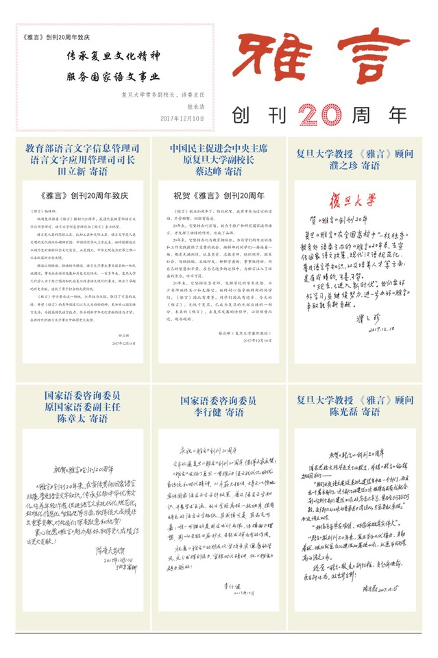 会前,教育部语用司、语信司司长田立新,上海市教委秘书长、语委副主任王从春,民进中央主席、原复旦副校长蔡达峰,国家语委咨询委员陈章太、李行健等发来贺词寄语,他们充分肯定《雅言》20年的工作成绩,勉励青年学子再接再厉。《雅言》印发了特刊,一并刊载留念。