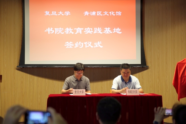青浦区文化馆馆长王伟与复旦学院副院长徐珂代表双方签署共建协议