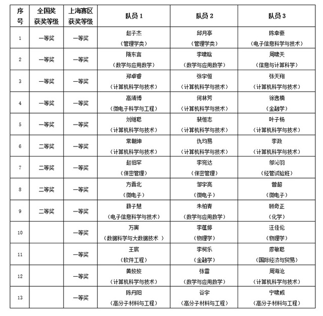 1 | 上海地区一等奖 | 倪中一 (数学与应用数学) | 殷聪珏 (信息与计算科学) | 张逸弛 (数学与应用数学) |