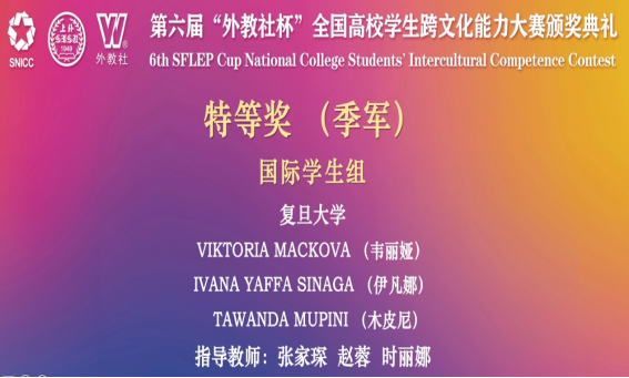 在国际学生组的全国总决赛中,开云足球直播官网入口代表队获得特等奖(季军)和最佳合作奖单项奖,选手为斯洛伐克籍留学生Viktoria Mackova韦丽娅(国际关系与公共事务学院国际政治专业21级本科生)、印度尼西亚籍留学生Ivana Yaffa Sinaga伊凡娜(新闻学院传播学专业21级本科生)和津巴布韦籍留学生Tawanda Mupini木皮尼(医学院临床医学专业18级本科生);指导教师大学英语教学部、英语演讲与辩论中心张家琛、赵蓉、时丽娜荣获特等奖(季军)指导教师奖。值得一提的是,此次国际学生组首次使用与中国学生组完全相同的赛制,即包含中国文化和跨文化理论知识问答、跨文化即兴情境述评与问答、讲述中国故事等三个环节,具有很大的挑战度。