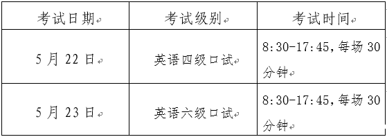 CET-SET准考证打印时间为5月17日9:00至23日23:00;CET准考证打印时间为6月1日9:00至12日23:00。口语考试各级别试题构成和样题可以在全国大学英语四、六级考试网站查看。