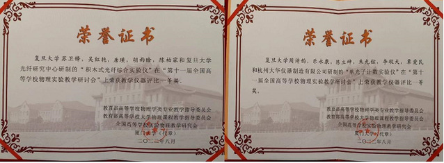 2022年8月10-14日,第十一届全国高等学校物理实验教学研讨会在厦门召开。在本次会议的自制实验教学仪器评比中,我校苏卫锋、吴红艳、唐璜、胡雨晗*、陈柏霖*等人的“积木式光纤综合实验仪”获普通物理实验仪器组一等奖(在参评的58套仪器中排名第一),周诗韵、乐永康、陈立坤*、朱允铉*、李牧天*等人的“单光子计数器实验仪”获近代物理实验组一等奖(在参评的33套仪器中与其他学校推荐的两套仪器并列第一),魏心源、吕景林、岑剡的“便携式双光源牛顿环实验装置”获得普通物理实验仪器组二等奖。(注:名字中带星号的是学生)